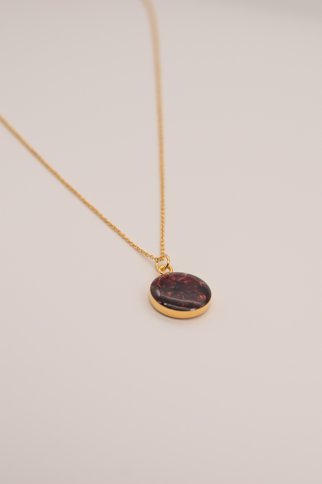 Náhrdelník má rozměr přívěsku ø 15 mm a délku řetízku 45 cm. Materiál řetízku je Ag925 pozlacený 24 K zlatem a materiál lůžka je pozlacená šperkařská ocel. Pozlacení je tvořeno dvěma vrstvami pro vyšší odolnost. Hmotnost 1 ks přívěsku je cca 1 g a 1 ks řetízku cca 1 g.
