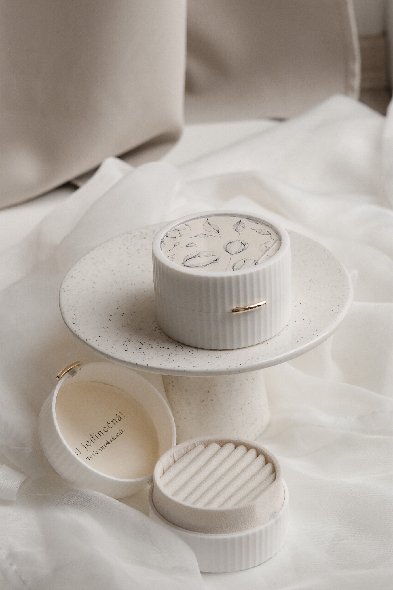 Delicata - její jméno znamená latinsky "jemná" - není jen šperkovnicí, je to společnice pro váš šperkový svět. Poskytuje bezpečné a elegantní úložiště pro vaše nejcennější kousky. Je vyrobena s láskou a péčí, aby vaše šperky zářily a vykouzlily úsměv na vašem obličeji. Její něžný bílý design se zlatými prvky a kulatý tvar okouzlí každou ženu na první pohled. Otevřete její víko a odhalte její tajemný vnitřek v béžovém odstínu, objevte dvě patra prostotu na šperky. Na víku najdete ručně kreslené květiny přímo od zakladatelky značky Evelin a díky vnitřku šperkovnice nikdy nezapomenete, jak krásná bytost se ve vás zrcadlí.